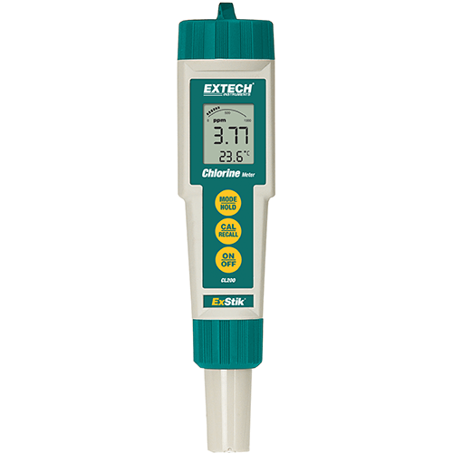 CL200 is an ExStik® Chlorine Meter. This revolutionary technique measures Direct Total Residual Chlorine from 0.01ppm to 10ppm. It makes non-subjective measurements unaffected by interferences associated with traditional colorimeters and spectrophotometers like sample color, turbidity, light, and pollutants. This product comes with an electrode, five packs of 10 reagent tablets (50 tests), a protective sensor cap, a sample cup with cap, four CR2032 batteries, and a 48” neck strap.
