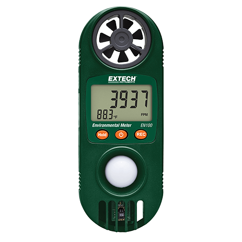 The EN100 is a Compact Hygro-Thermo-Anemometer with Light Sensor. 11-in-1 Environmental Meter for indoor and outdoor conditions. Built in light sensor measures light level. Auto-rotating display depending on selected function. Also measures Air Velocity, Air Flow, Temperature, Humidity, Wet Bulb, Dew Point, Heat Index, Wind Chill, Barometric Pressure and Altitude. Complete with built-in multiparameter sensors, wrist strap, and CR2032 battery.