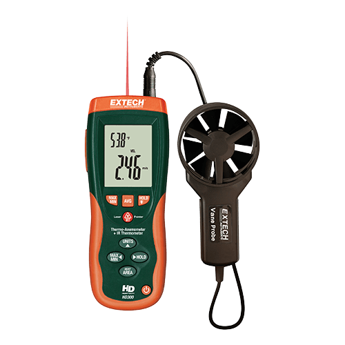 This Thermo-Anemometer features an Infrared Thermometer that measures remote surface temperatures to 932°F (500°C) with 30:1 distance to target ratio and Laser pointer. It can simultaneously display of Air Flow in CFM/CMM or Air Velocity Plus Ambient Temperature. Meter has easy to set Area dimensions that are stored in the meters internal memory for the next power on. Additional features include: large (9999 count) LCD backlit display, 20-point average for airflow, and a heavy duty rugged double molded housing. Comes complete with vane sensor with 3.9ft (120cm) cable, software with cable, carrying case, and 9V battery.