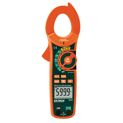 MA620 is a True RMS, autoranging AC clamp meters offer plant maintenance techs, electrical troubleshooters, and DIYers a test instrument that delivers a combination of high performance and exceptional value. In addition to a host of advanced multimeter and current measurement capabilities, it also has a built-in, non-contact (NCV) voltage detector. You can select auto- or manual-ranging modes, measurement functions cover all types of troubleshooting over and above noninvasive current probe measurements: voltage, resistance, capacitance, frequency, duty cycle, diode and continuity tests. Even measure temperature with the supplied Type K bead wire probe. Complete with test leads, general purpose Type K bead wire temperature probe, 9V battery and carrying case.